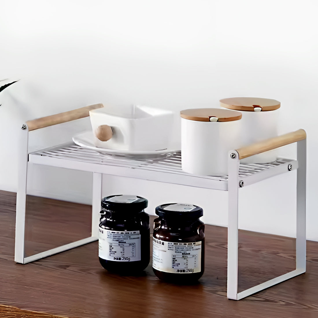 DecorTwist Cabinet Organizer Stainless Steel 1-Tier Shelf is a versatile and stylish storage solution for any space. With its sleek stainless steel construction and wooden handles, this multi-purpose rack adds both functionality and elegance to your kitchen, bathroom, office, or pantry. The two-tier design offers ample space for organizing spices, toiletries, office supplies, or even small kitchen appliances. Perfect for maximizing vertical space, it helps keep countertops tidy and accessible, making it an ideal addition to any home or workspace that needs extra organization.