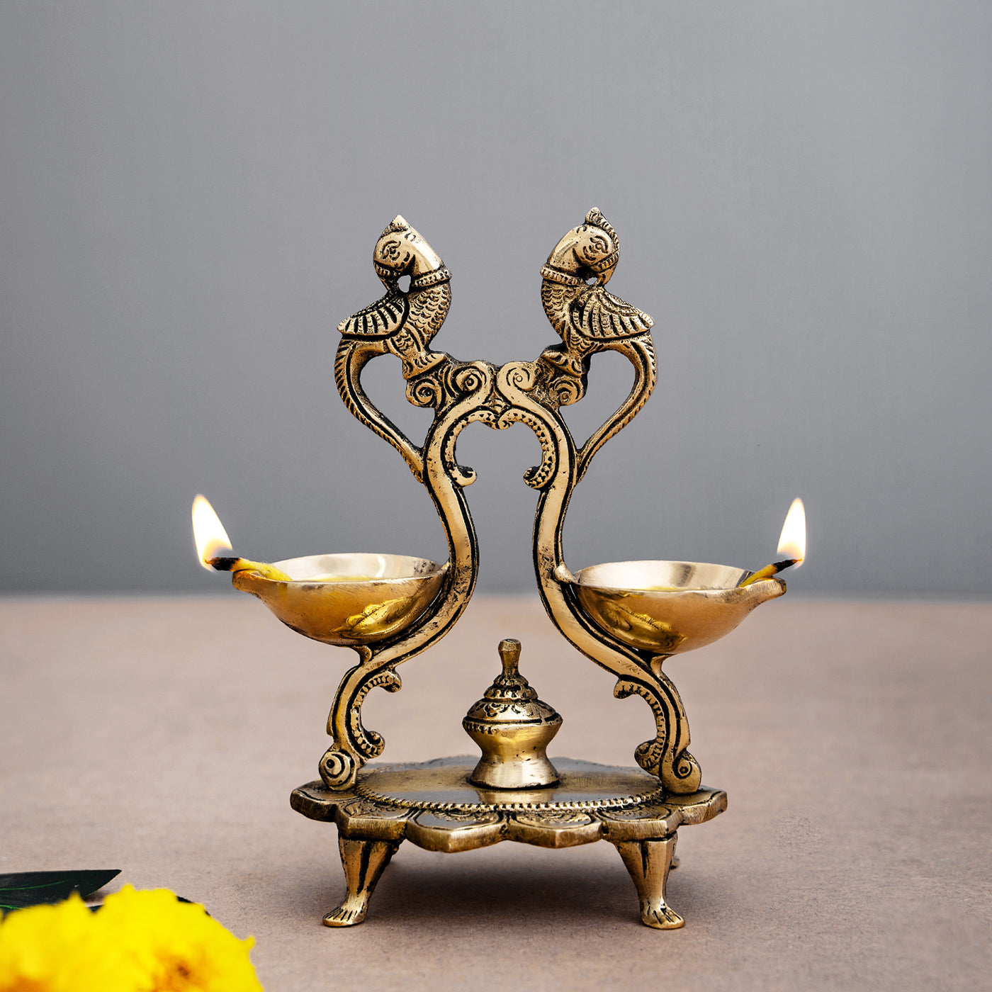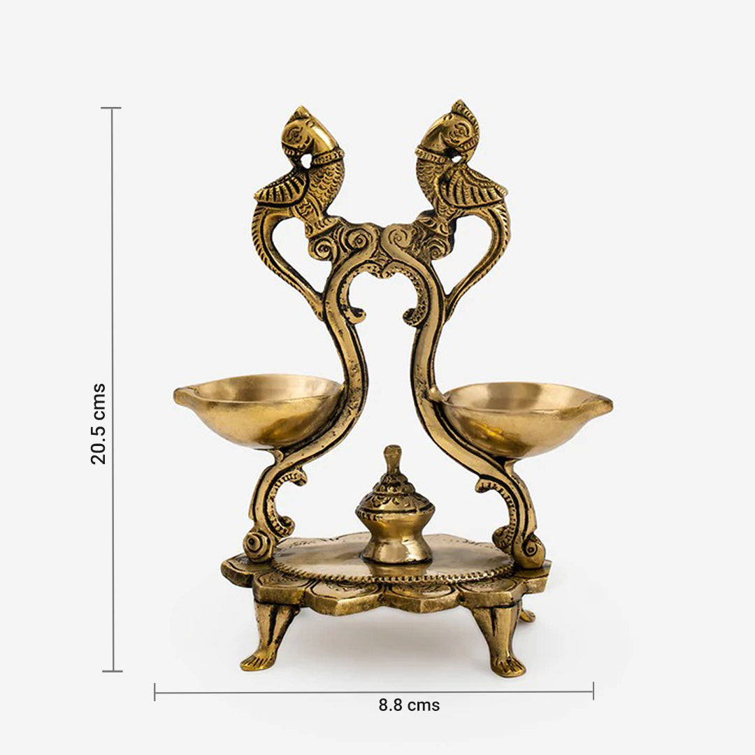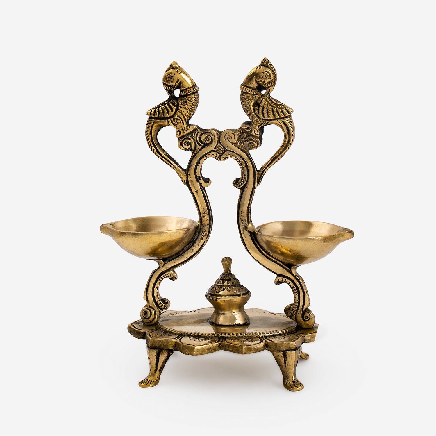 Handcrafted with minimalistic finesse, this set of twin oil wick lamps exudes a traditional appeal. Flaunting a lush peacock design atop its solid brass body, they come with an elaborate motif carved at the sides, reminiscent of old-world charm.