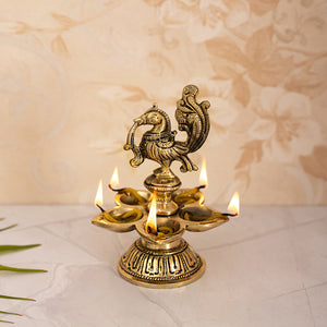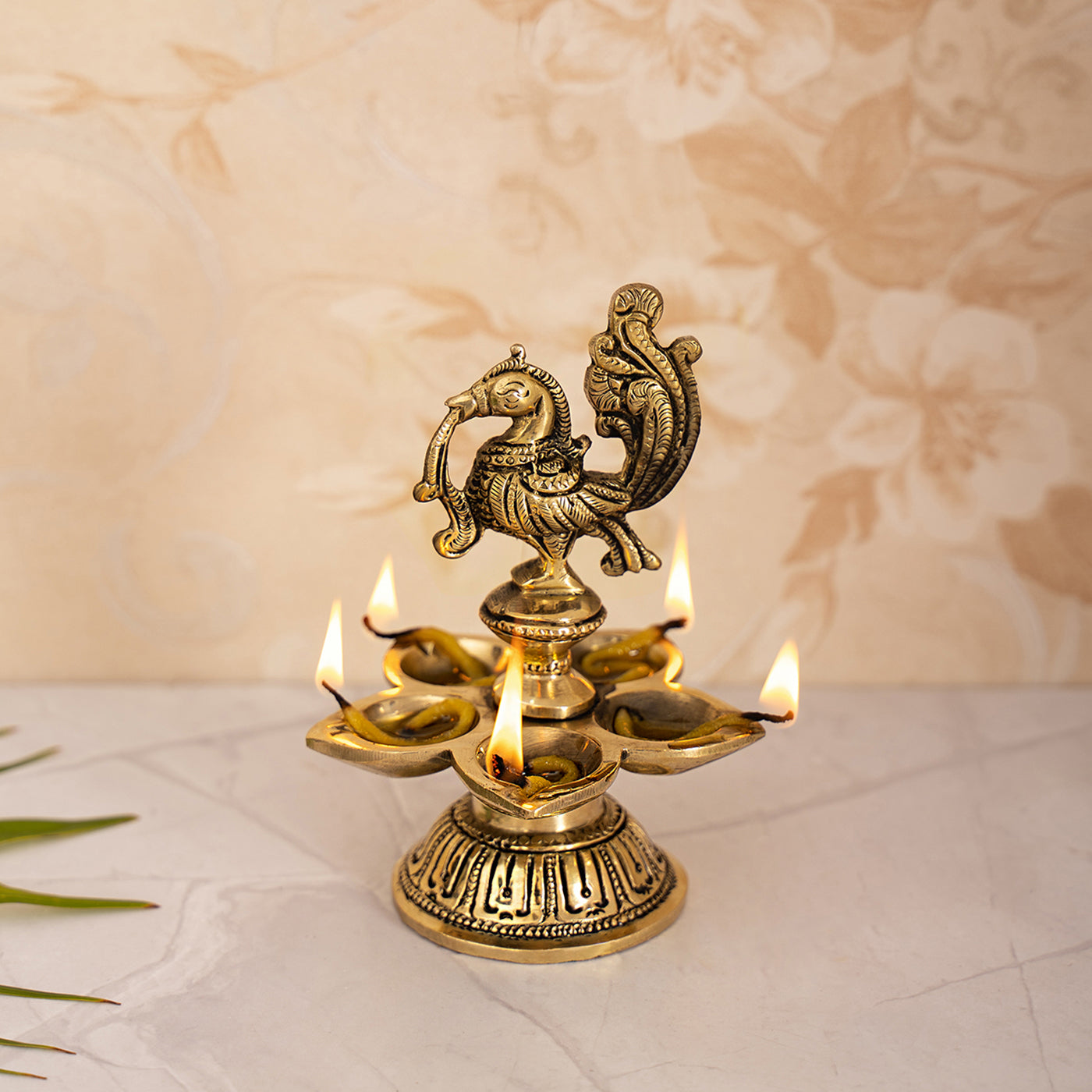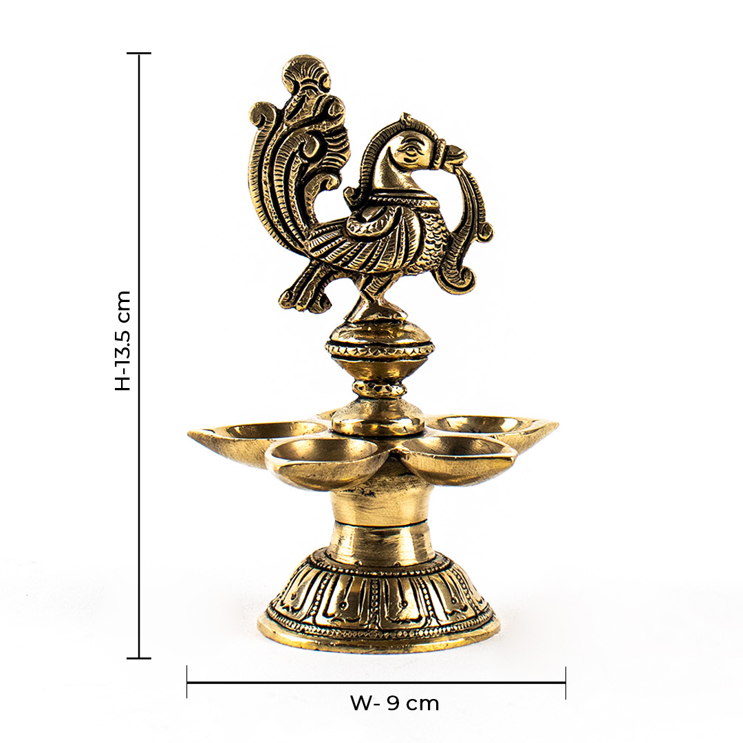 This Brass Annapakshi Peacock Diya With 5 Wick is an ideal Diya for your home as well as for gifting on any occasion. Ideal for use in every ritual and ceremony, it makes a great choice of gift for house warmings, wedding celebrations, Diwali, Karthigai Deepam, Vijayadashami, new year, etc.