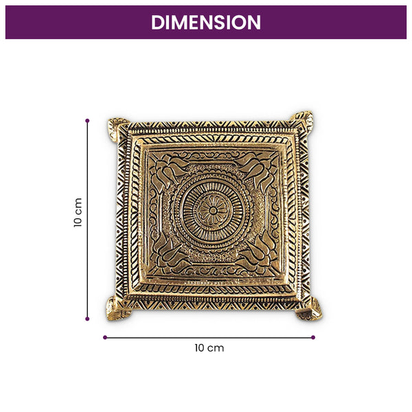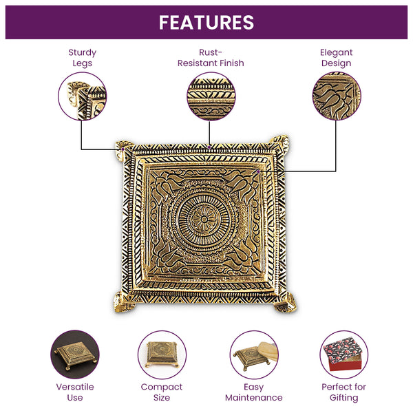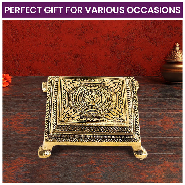 Handcrafted Design: Featuring an intricate lotus motif and a square shape, this chowki is skillfully crafted from premium brass. Its gold antique finish exudes elegance, making it a perfect fit for enhancing the sanctity and aesthetic of your pooja mandir.