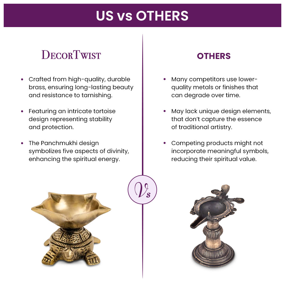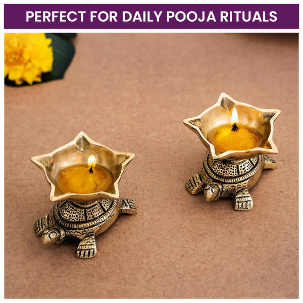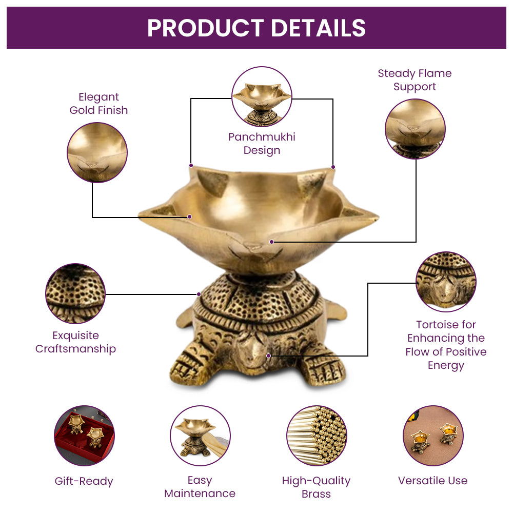 - Panchmukhi Tortoise Design: Featuring a five-faced diya set in the shape of a tortoise, this brass oil lamp symbolizes prosperity and spiritual harmony. Its distinctive design enhances the ambiance of your pooja room or festive setup, making it a meaningful addition to your rituals.