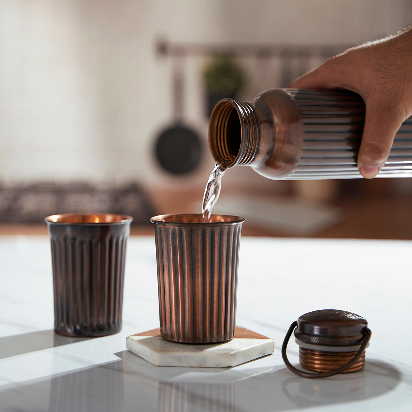 DecorTwist presents a pure, leak-proof copper bottle with two glasses, offering multiple health benefits. Copper is a metal preferred by our grandparents and ancestors for its numerous health advantages and as an economical solution for clean water. To gain the best benefits from copper, fill the bottle with water, leave it overnight, and drink the water the next morning using the included glasses. According to Ayurveda, drinking copper-enriched water first thing in the morning on an empty stomach helps balance the body's systems. This practice also ensures the proper functioning of various organs and metabolic processes. Water stored in a copper vessel remains fresh for extended periods and never becomes stale. Copper is an essential trace mineral vital to human health and helps neutralize toxins. Unlike some nutrients, the body cannot produce copper, so drinking 2 to 3 glasses of water stored in a copper vessel is an effective way to supply your body with this necessary mineral.