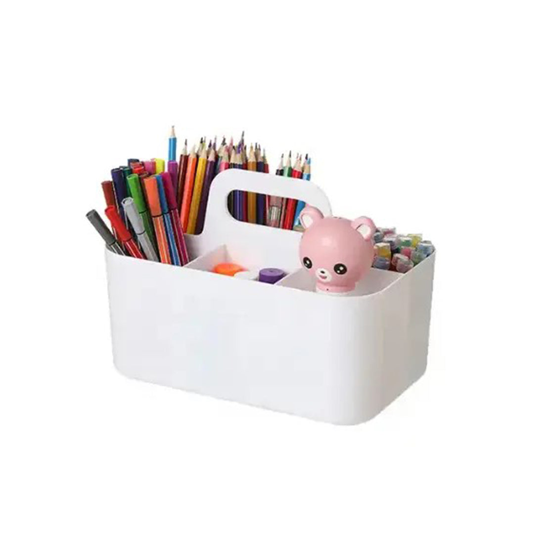 Multi-functional Desk Organizer is a versatile storage box with 5 compartments, designed to keep your essentials organized and accessible. Made from sturdy plastic, it serves as a convenient solution for a range of uses across your home. In your bedroom or vanity, it’s perfect for arranging makeup products, brushes, and skincare items. On your office desk, it neatly holds pens, pencils, sticky notes, and other stationery. In the bathroom, it can store toothpaste, toothbrushes, razors, and more. Compact yet spacious, this organizer effortlessly reduces clutter and adds a touch of order to any space, making it an ideal accessory for modern, organized living.