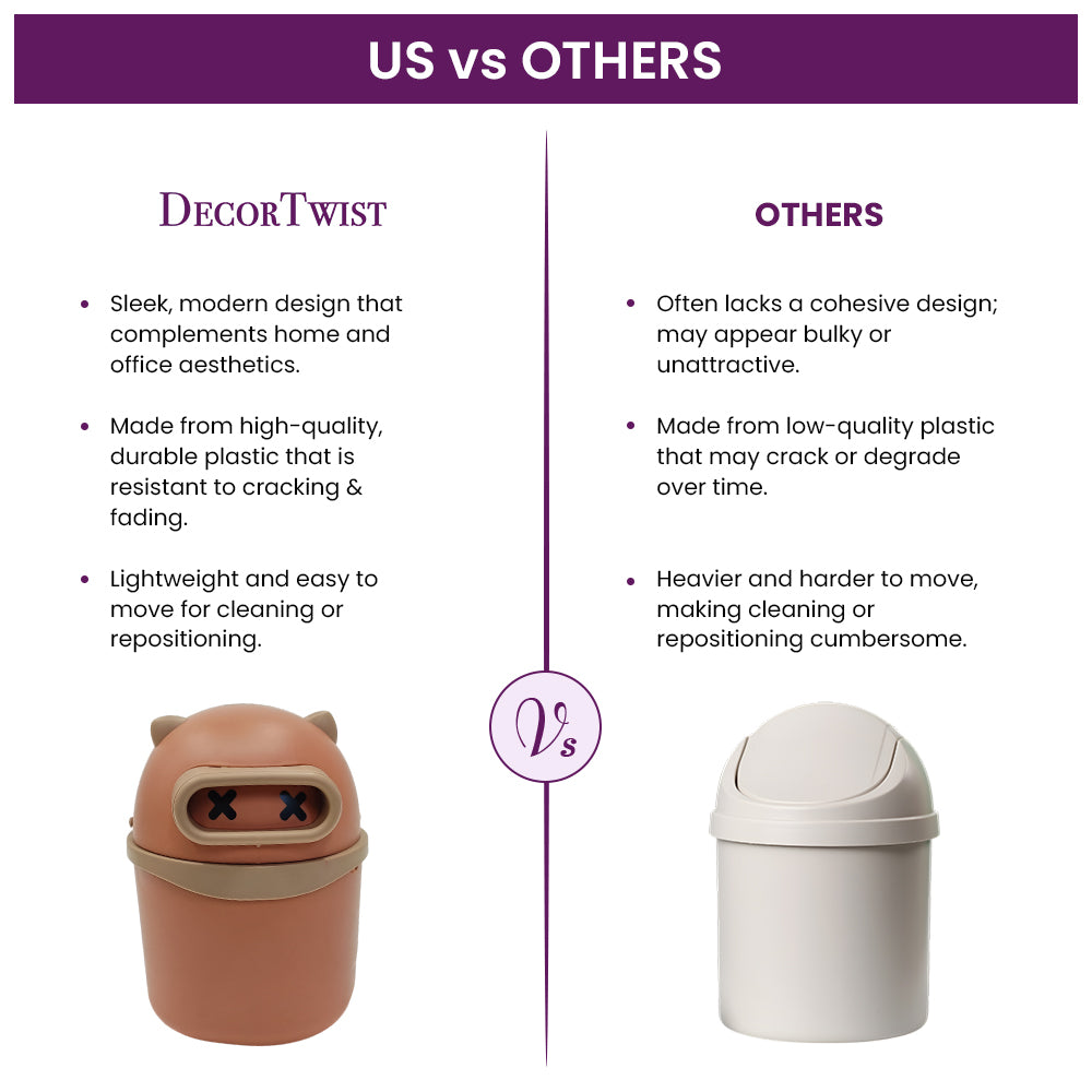 DecorTwist introduces the perfect Table Dustbin, designed for both domestic and commercial use. This compact and versatile mini dustbin is ideal for office settings, allowing you to dispose of trash effortlessly while working or reading. It’s equally convenient for use near your bed, making it easy to discard waste without hassle. Equipped with a swing lid, this dustbin ensures smooth and efficient waste disposal. Crafted from durable plastic, it is sturdy and built to last. Its compact design saves space and fits seamlessly into small areas. You can conveniently attach it to any cabinet, drawer, or door, making it an excellent space-saving solution for your needs.