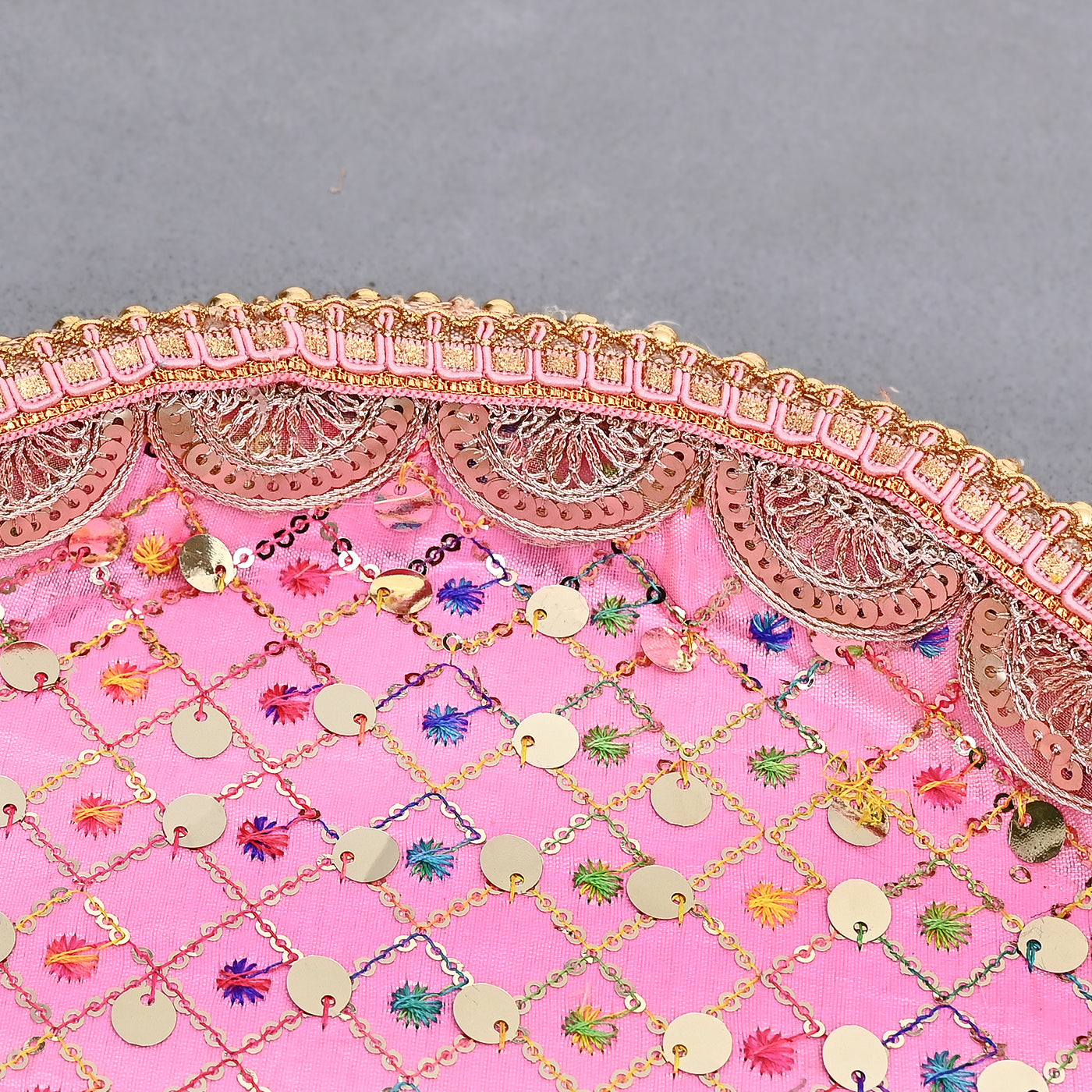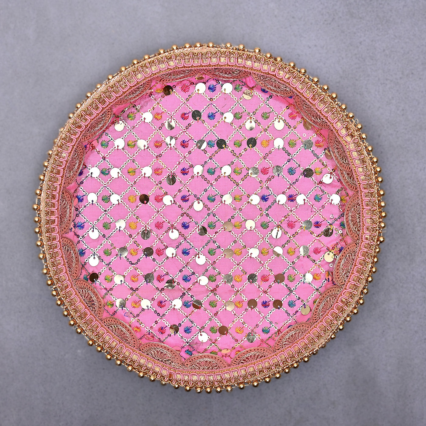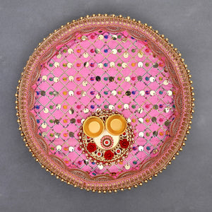 Make your celebrations truly special with our stunning Pooja Thali. This exquisite thali features a border adorned with fancy golden beads, adding a touch of elegance to the design. In the center, a captivating square patch in golden with sparkling stones creates a mesmerizing focal point.