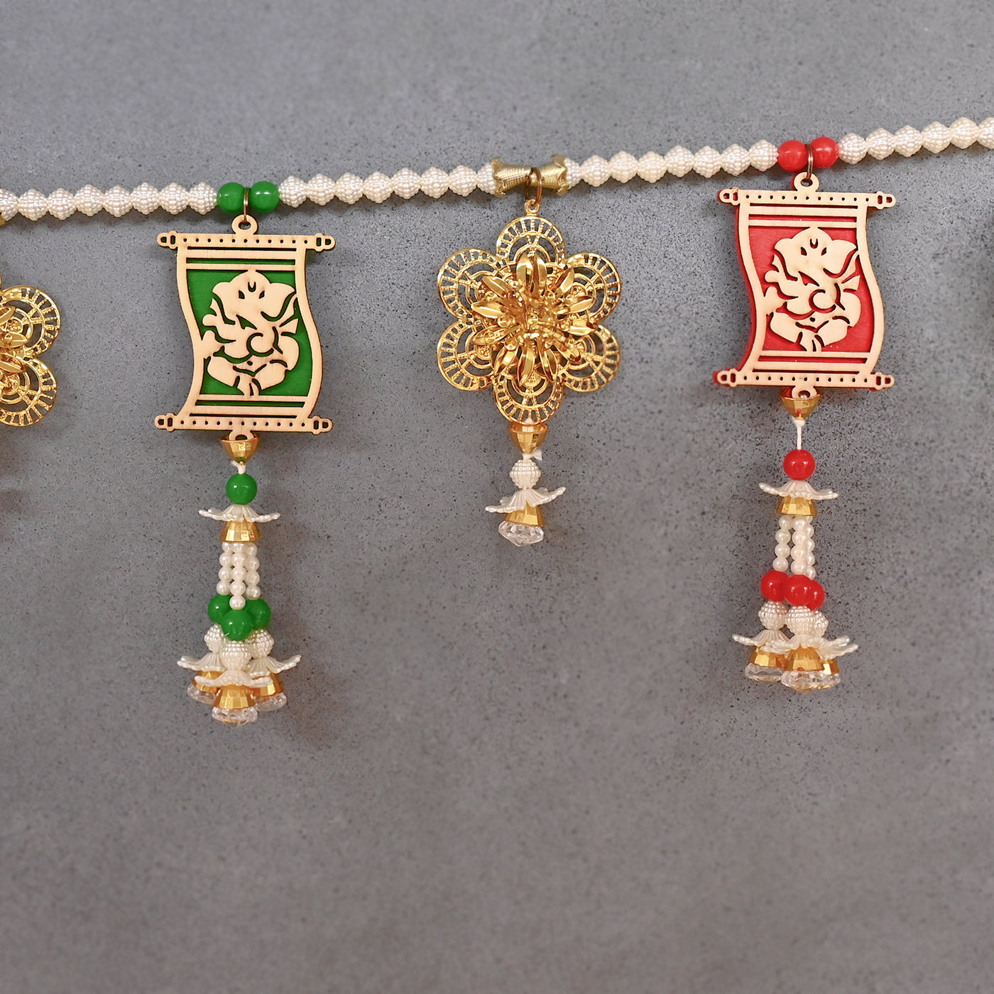 Elevate your decor with our Wooden Ganesh Ji Toran, adorned with handcrafted flowers and braided beads. This exquisite toran reflects the perfect blend of craftsmanship, beauty, and enduring quality. Each detail is a testament to artistry, making it a masterpiece for your home. Ideal for adorning your space with divine blessings.